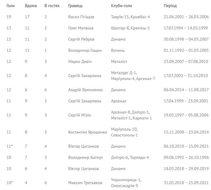 Найдовші серії реалізованих гравцями пенальті в Чемпіонатах України (1992 – 27.09.2021)