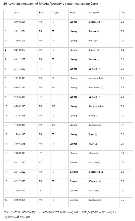 Розгромний програш динамівців від "Баварії" (0:5) став 20-м в українській кар'єрі Мірчі Луческу. 15 разів при румунському тренері побував у "нокауті" "Шахтар" і 5 - "Динамо". 15 великих поразок Луческу зазнав у Лізі чемпіонів, 4 - у чемпіонатах України та 1-у Суперкубку України. Розгроми підопічним Містера завдавали 13 команд. Частіше за інших "Барселона", "Мілан" - по 3 рази, "Баварія", "Динамо" і "Шахтар" - по 2. Причому "удари" від "Баварії" були найбільш відчутними. З рахунком 0:7 у березні 2015 року програли мюнхенцям гірники і 0:5 нині кияни.