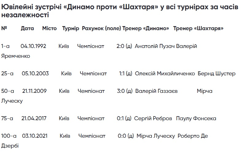 - «Динамо» провело ювілейний, 100-й, матч із «Шахтарем» у всіх турнірах за часів незалежності України. В чемпіонатах зіграно 68 матчів, єврокубках – 2, Кубку – 16 та Суперкубку – 14. Баланс усіх матчів: +35=26-39, м’ячі 116-128.