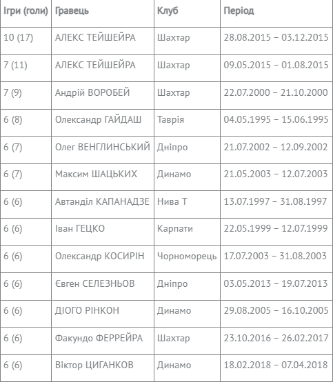 Найдовші голеві серії гравців у Чемпіонатах України (1992 – 05.10.2021)
