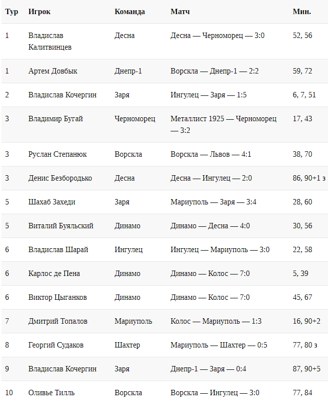 Подібним чином відзначилися представники дев'яти клубів. По три дублі у Динамо і Зорі, по два — у Десни і Ворскли. При цьому лише кияни зробили два дуплети за матч — у грі з Колосом (7:0).
