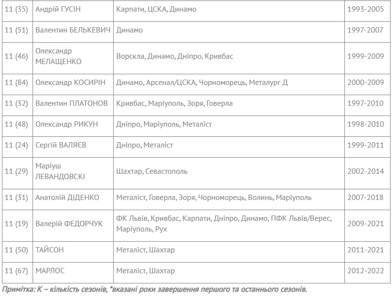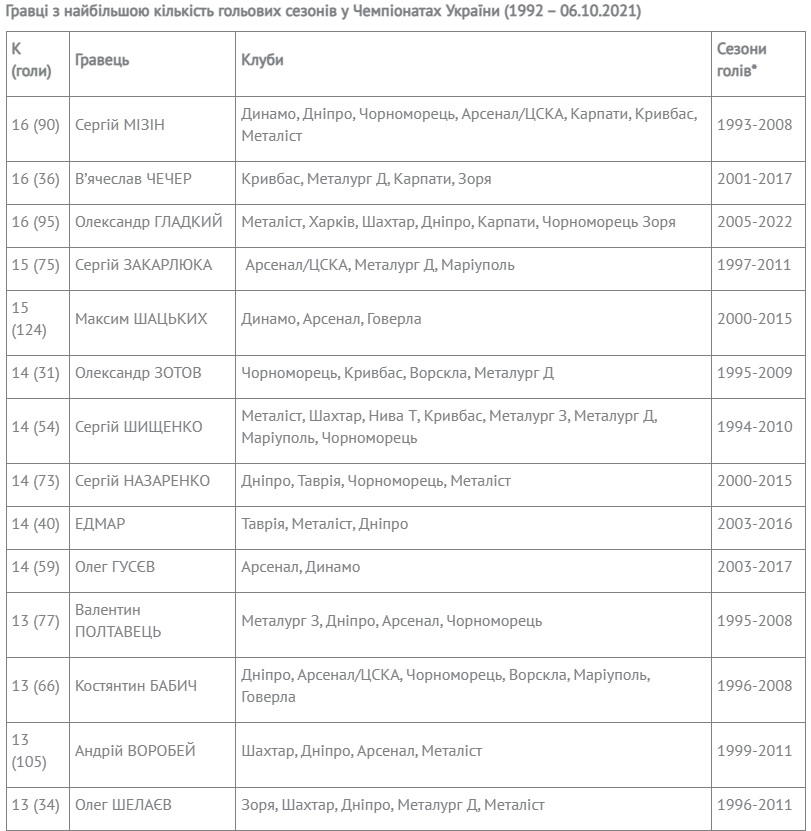 …Окрім традиційних історичних списків гвардійців та найкращих бомбардирів усіх Чемпіонатів України, викликає інтерес і список голеадорів із найбільшою кількістю сезонів, у яких вони забивали бодай один м’яч у ворота суперників. І лідерство у цьому рейтингу наразі розділяють троє футболістів – півзахисник Сергій Мізін, захисник В’ячеслав Чечер та чинний нападник «Зорі» Олександр Гладкий, в активі яких по 16 забивних сезони. Може збільшити число забивних Чемпіонатів до 13-ти чинний футболіст Євген Селезньов («Минай») і до 12-ти – Валерій Федорчук («Рух»). Серед гравців, що вже забивали голи у Чемпіонаті-2021/22, виділимо тих, які довели кількість своїх гольових сезонів до 10-ти. Це Младен Бартуловіч («Інгулець»), Денис Гармаш («Динамо»), Артем Громов («Зоря») та Дентіньо («Шахтар»).