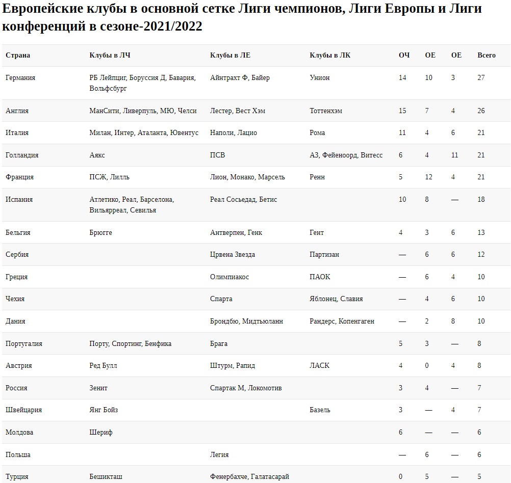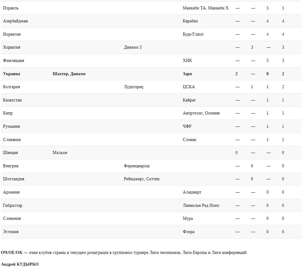 Гірше показники тільки у країн, які представлені в групових турнірах ЛЧ, ЛЄ і ЛК меншою кількістю клубів. При цьому вище нас - Фінляндія, Хорватія, Норвегія, Азербайджан, Ізраїль, Польща, Молдова...