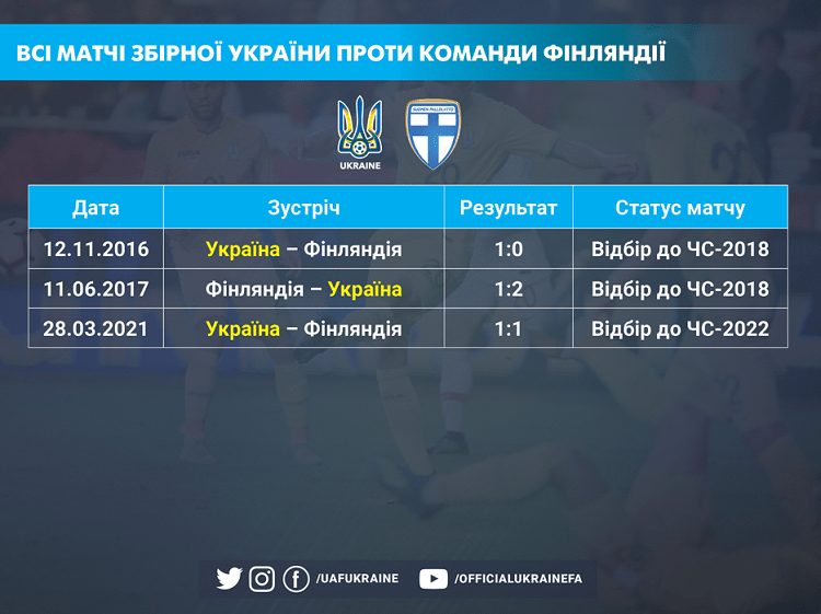 Статистична перевага за підсумком трьох попередніх матчів — на боці нашої збірної: дві перемоги й нічия, різниця забитих і пропущених м’ячів — 4—2 на користь українців. Голами у ворота Суомі можуть похвалитися чотири гравці синьо-жовтих: Артем Кравець, Євген Коноплянка, Артем Бєсєдін та Сергій Сидорчук. Правда, лише останній нині перебуває під рукою в. о. головного тренера збірної України Олександра Петракова.