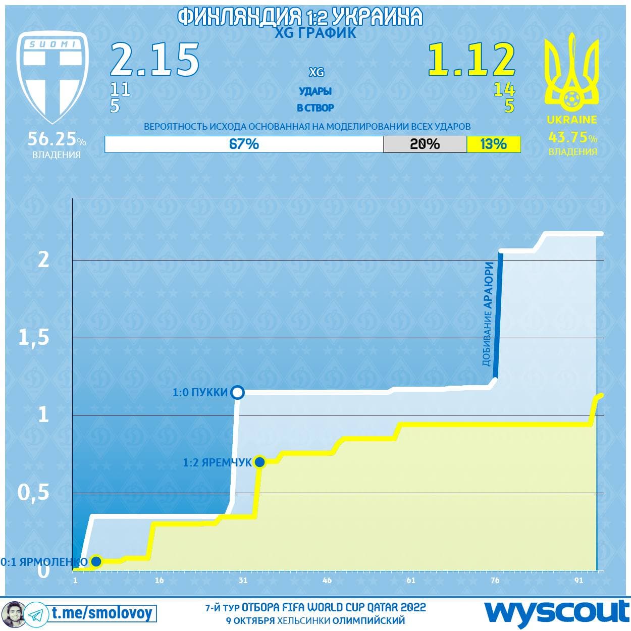 Плюс ще 0.17 xG - удар Корнієнко в клатчі. У фінів же один тільки гол Пуккі з короткої дистанції оцінили в 0.71 xG - вище, ніж два наших кращих моменти разом. Звідси логіка моделі більш-менш ясна. Імовірність Пуккі забити свій вище ймовірності Яремчука забити свій.