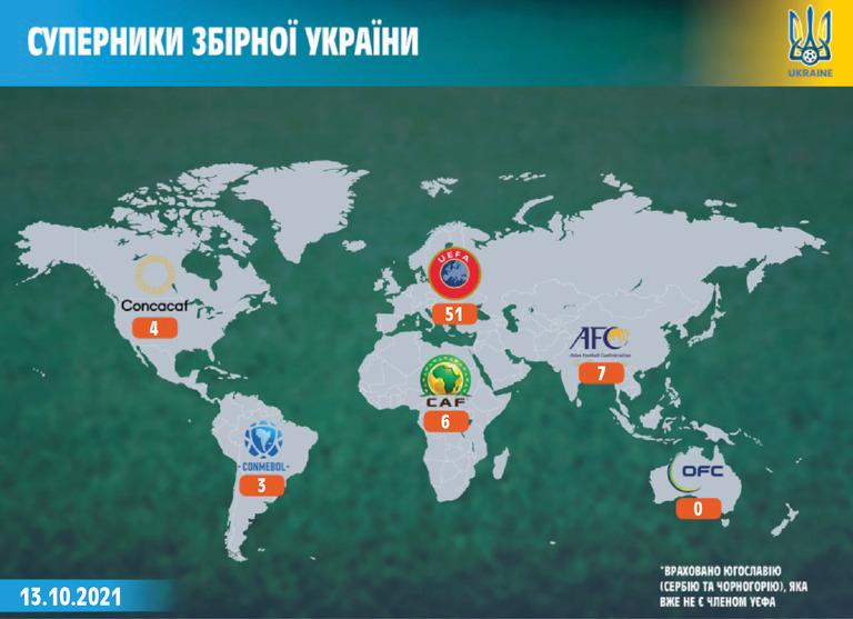 Загалом серед суперників України — 51 представник Європи, сім — Азії, шість — Африки, чотири — зони КОНКАКАФ та три — Південної Америки. Не зустрічалися ми поки що тільки з колективами Океанії.
