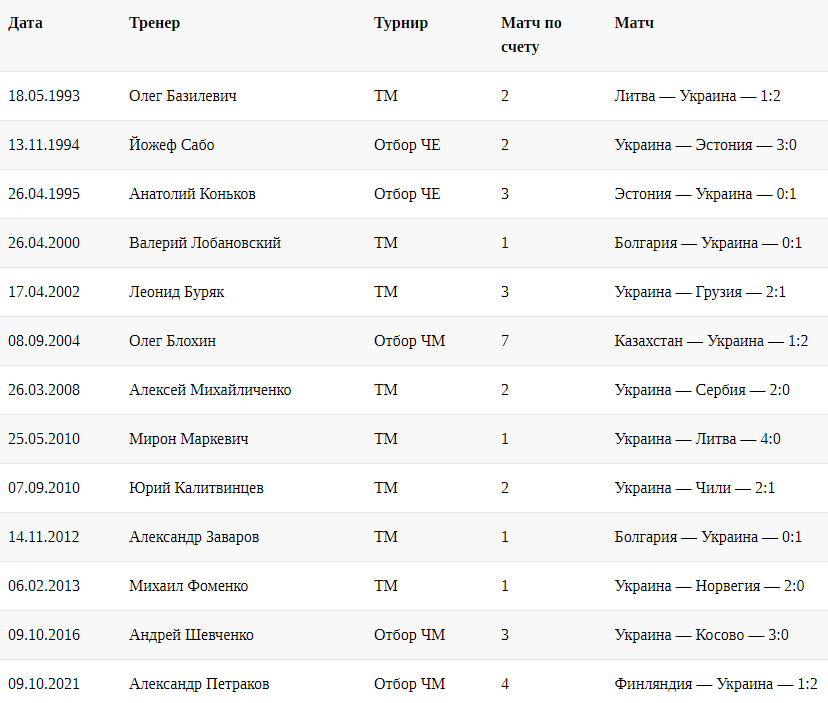 У першій же грі біля керма збірної перемагали чотири фахівці, у другій - також чотири, у третій - три. Петракову знадобилося чотири матчі, а Блохіну - аж сім. Суперниками нашої збірної в цих іграх були 10 команд. По два рази - Литва, Естонія і Болгарія.