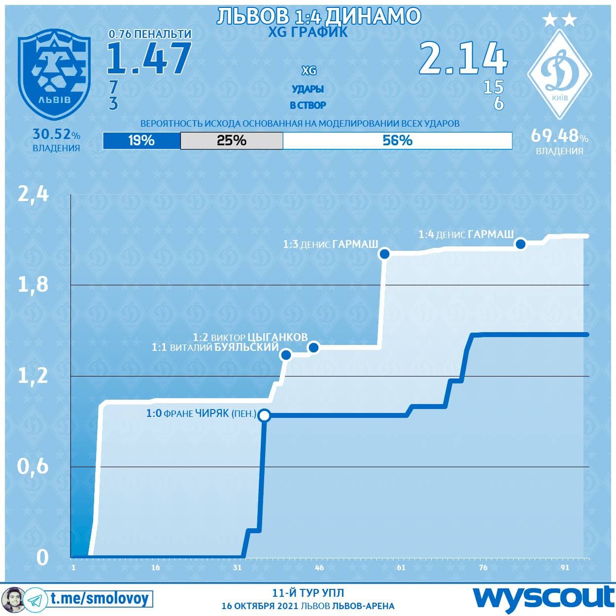Імовірність Динамо забити 4 становила лише 7.61%, ймовірність Львова забити 1 дорівнювала 10.83%.