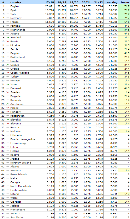 Зараз таблиця коефіцієнтів УЄФА виглядає наступним чином: