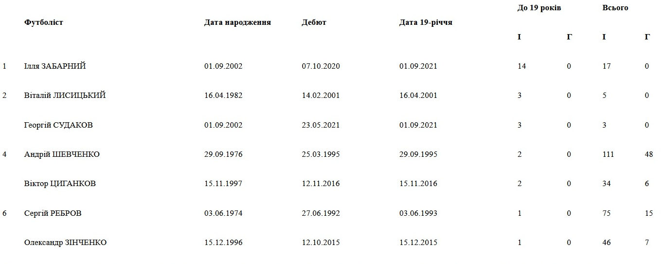 Із чинних футболістів збірної дуже потужний темп демонстрував Олександр Зінченко. В аналогічній таблиці гвардійців до 20-річчя він мав 11 матчів (у другого в рейтингу Геннадія Зубова — всього 5). А у таблиці гвардійців до 21-річчя Зінченко випереджав Шевченка — 13:11.