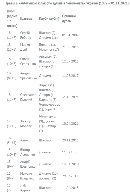 Раніше по 18 дублів оформляли в УПЛ ще чотири голеадори — Сергій Ребров, Марко Девич, Євген Селезньов та Андрій Ярмоленко. Кількість усіх голів Олександра Гладкого в українських чемпіонатах збільшилася до 98-ми.