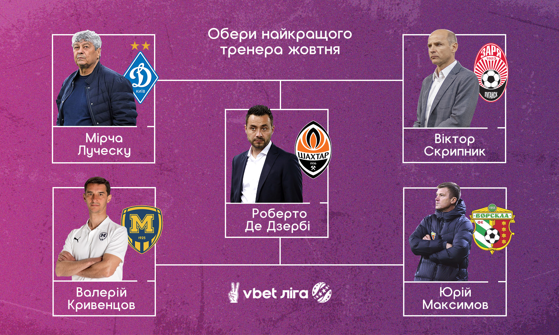 У голосуванні за топ-наставника беруть участь: Мірча Луческу («Динамо»), Роберто Де Дзербі («Шахтар»), Віктор Скрипник («Зоря»), Юрій Максимов («Ворскла»), Валерій Кривенцов («Металіст 1925»).