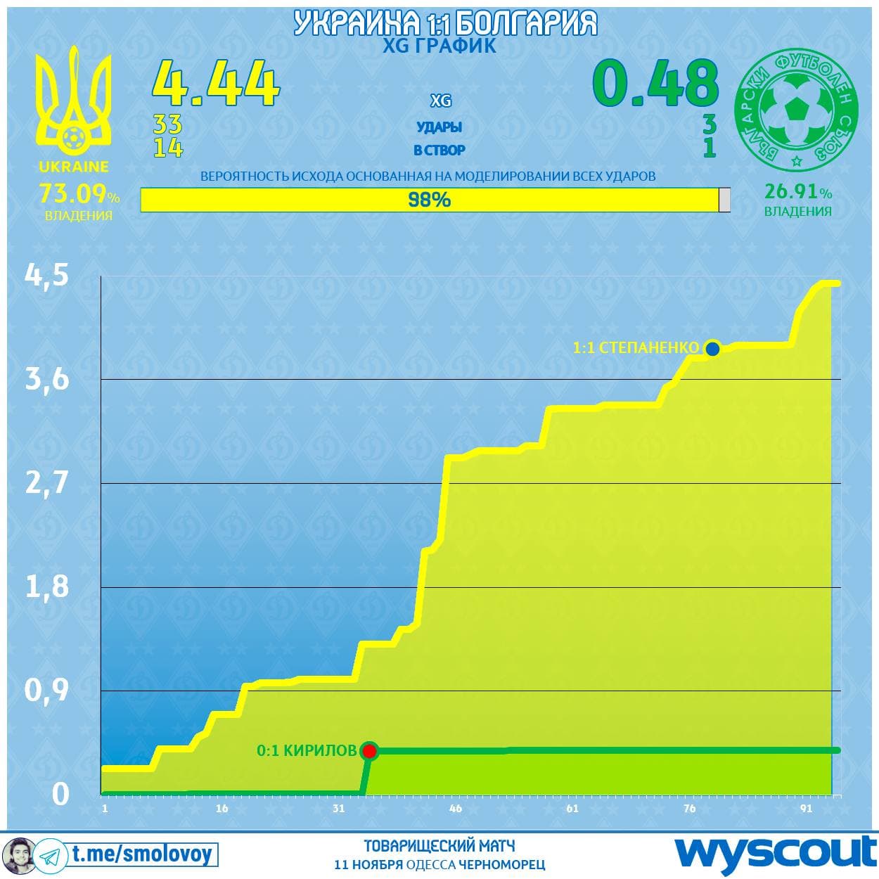 Цифра вийшла дійсно значною - 4.44 xG. Імовірність переможного результату в цьому матчі - 98%, ймовірність нічиї - менше 2%.
