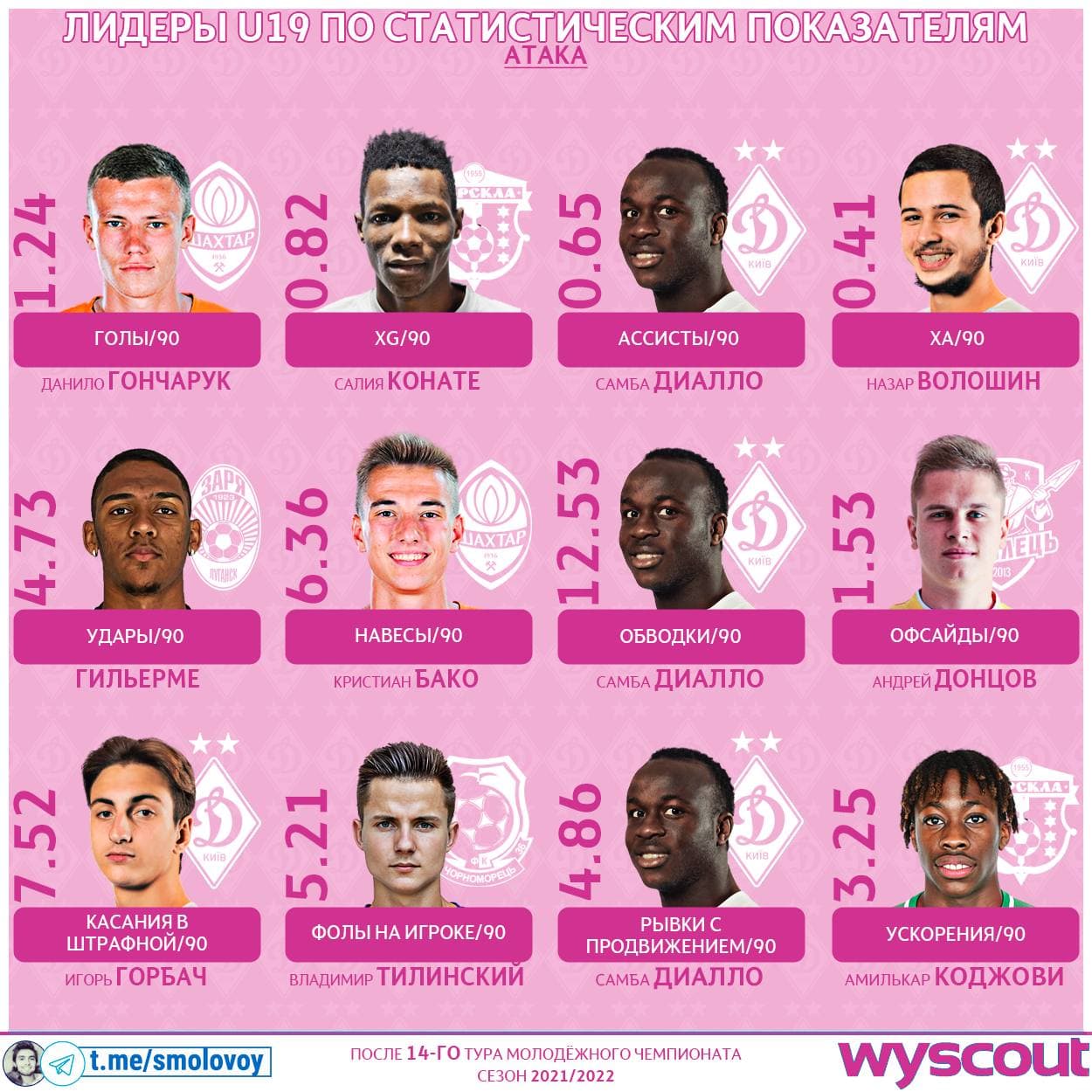 Без зайвої скромності Самба Діалло може говорити, що він найкращий футболіст нашого чемпіонату U19 прямо зараз. Практично скрізь з 12 базових метрик він в топ-5. Лідирує в трьох: