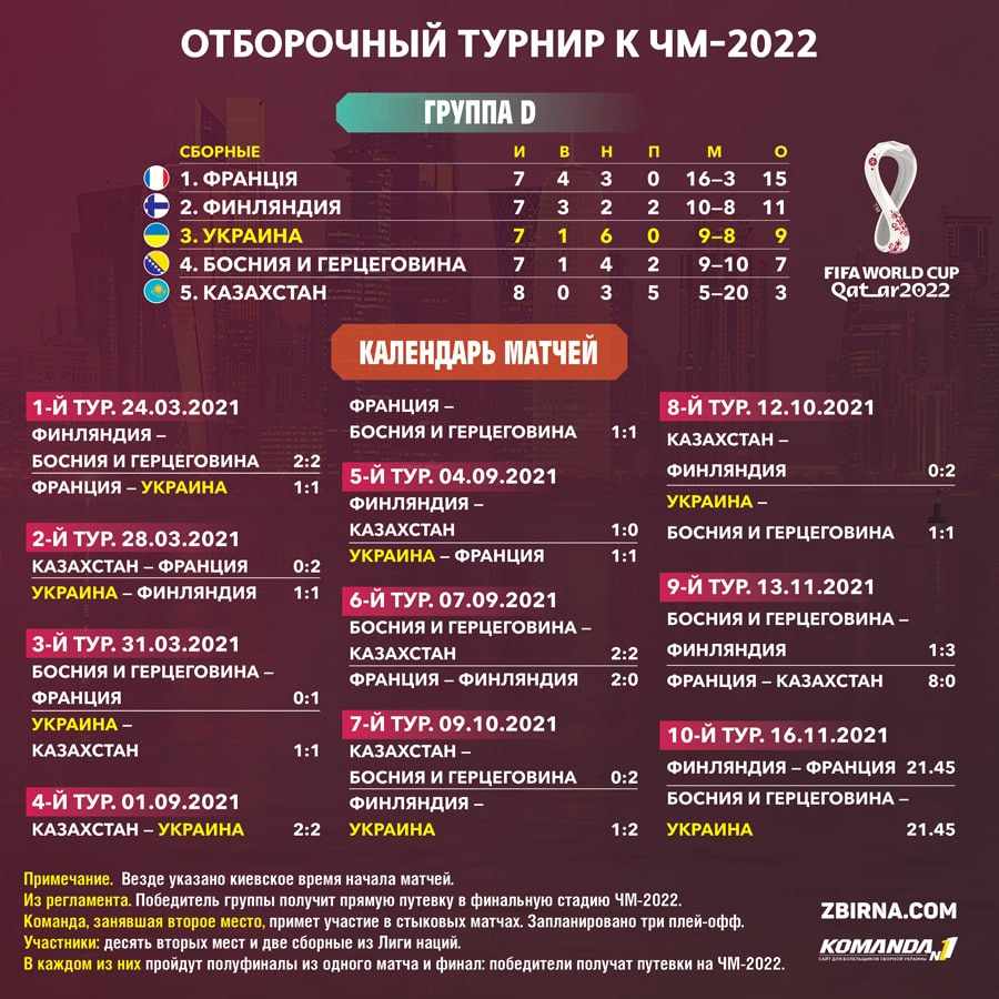 1. 16 листопада фіни вдома приймають Францію. Їхня перемога з будь-яким рахунком залишає Україну за бортом подальшої боротьби за путівку на мундіаль.