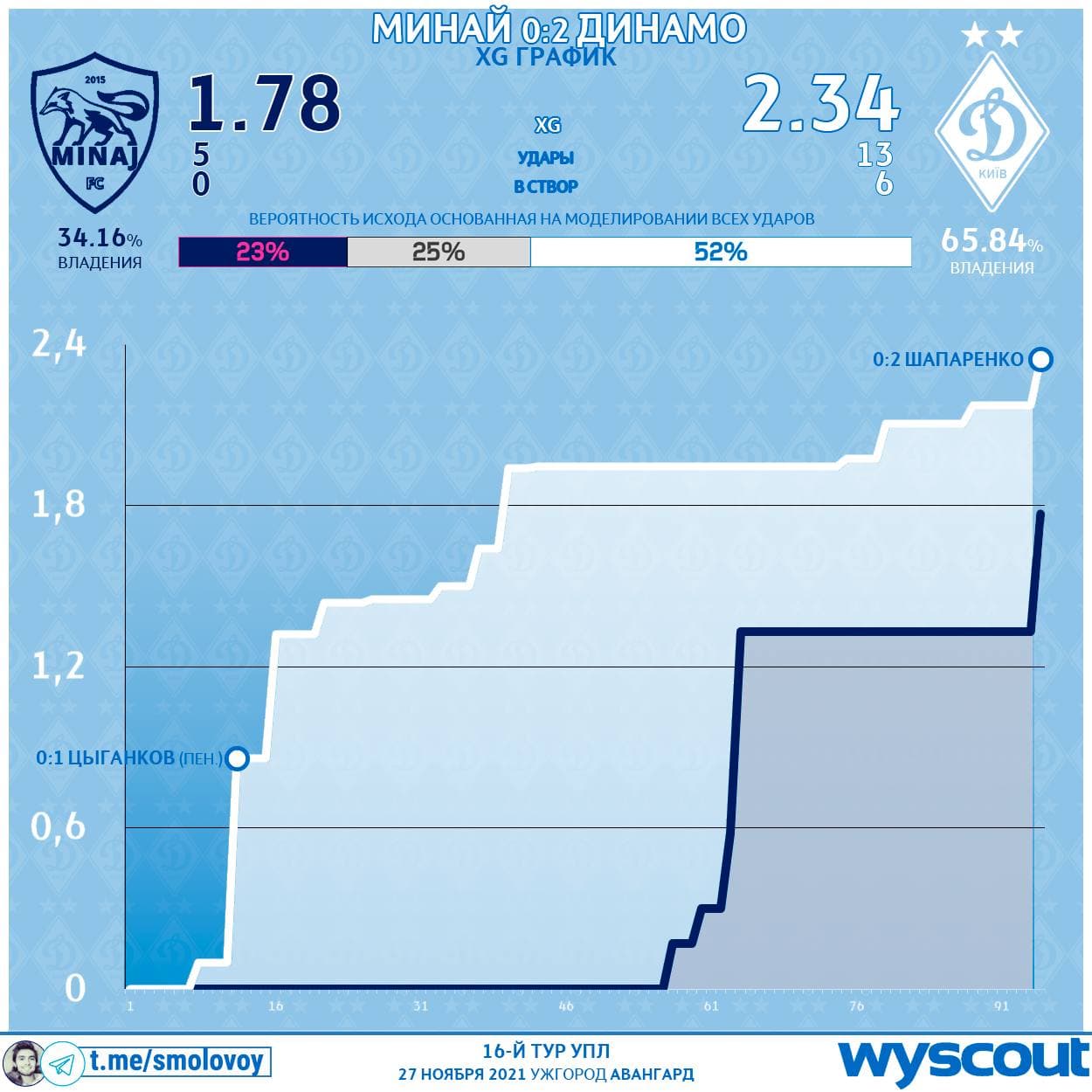 У першому таймі Динамо завдало 9 ударів (разом в пенальті) на 1.94 xG, у Миная 0.0!