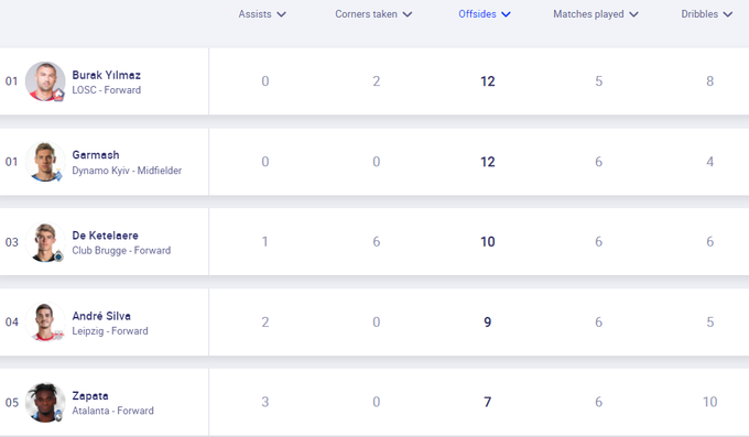 Стільки ж поза грою (12) у турецького нападаючого «Лілля» Бурака Їлмаза. Третім у такому рейтингу йде нападник «Брюгге» Шарль Де Кетеларе (10).