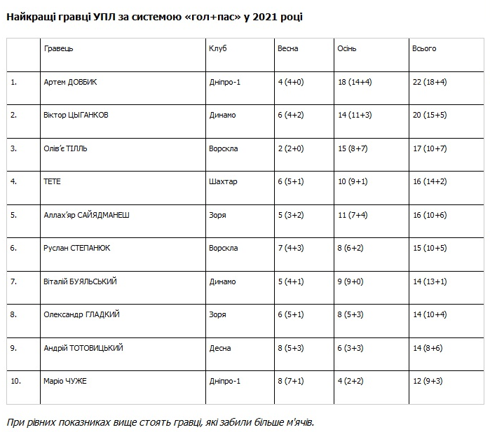 Найкращим гравцем УПЛ за системою «гол+пас» у 2021 році став 24-річний форвард «Днера-1» Артем Довбик. За весну та осінь він забив 18 м'ячів і зробив 4 результативні передачі.