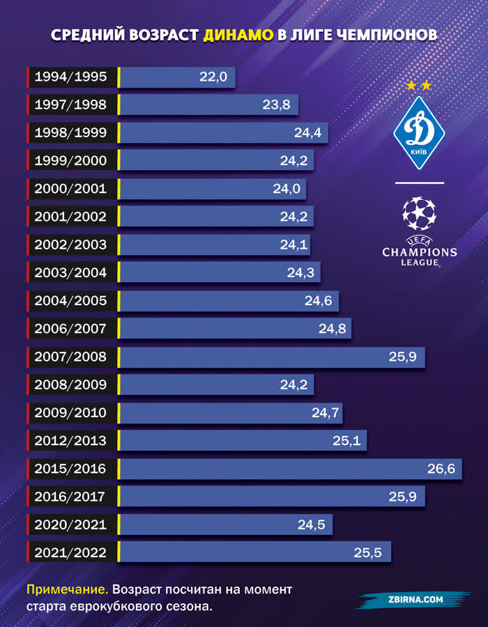 Середній вік біло-синіх в останній ЛЧ склав 25,5 року. Середній вік Динамо за всю історію турніру - 24,6 року. Так що не потрібно поспішати з висновками. Ось у Йожефа Сабо, в 1994 році, - це так, це була зовсім юна команда (22,0 року). А Валерій Лобановський доходив до півфіналу Ліги чемпіонів з колективом, якому було 24,4 роки. Найстарша команда, до слова, опинилася у Сергія Реброва-в 2015 році її середній вік ледь не дотягнув до 27 років.
