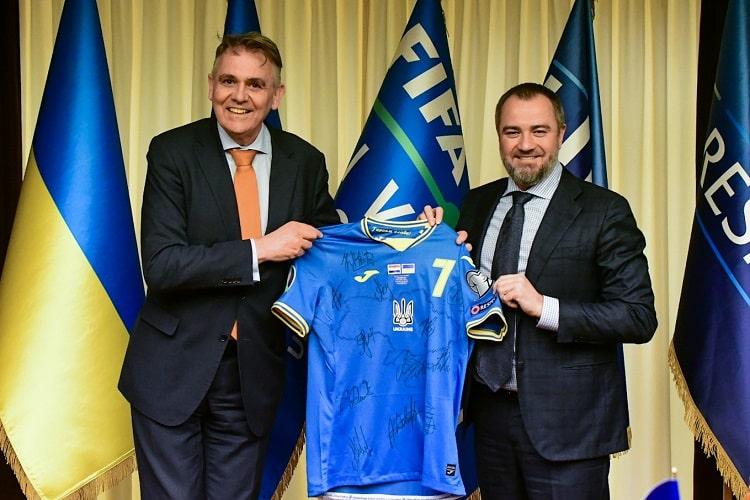 Під час зустрічі з президентом УАФ Андрієм Павелком посол Нідерландів Йеннес де Мол висловив схвальні відгуки про форму збірної України з гаслами "Слава України" і "Героям слава".