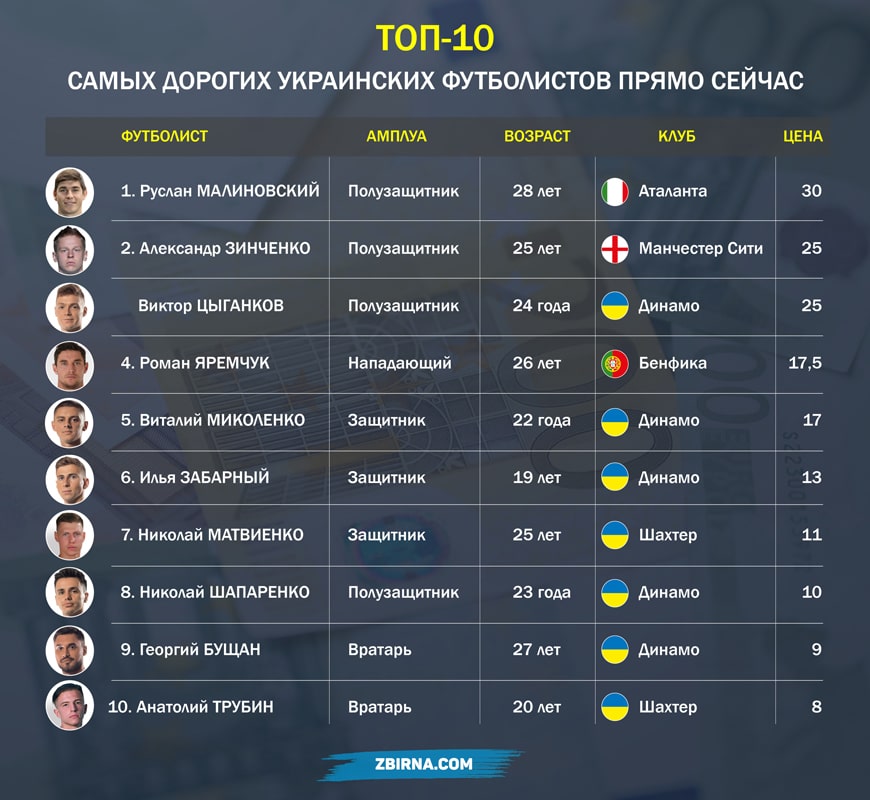 У цьому реєстрі знайшлося місце четвірці з київського Динамо, дуету - з Шахтаря і по одному футболісту — з італійської Аталанти, англійських Евертона і Манчестер Сіті і португальської Бенфіки. Загальна ж вартість десятки склала 165,5 млн євро.