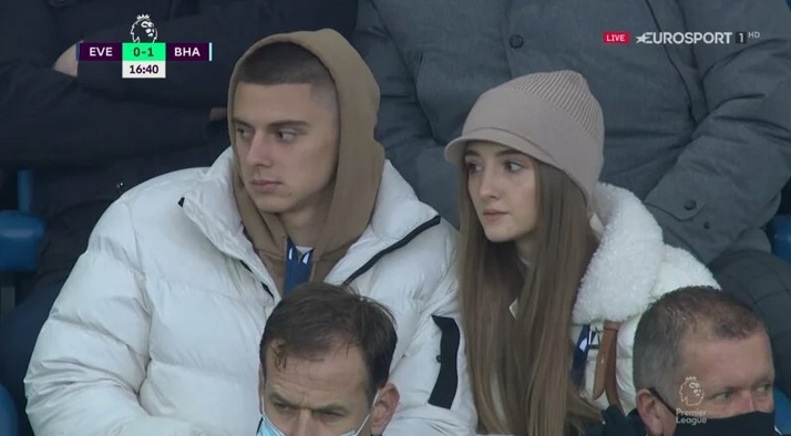 Віталій Миколенко зі своєю дівчиною дивиться на трибуні матч "Евертона" проти "Брайтона"