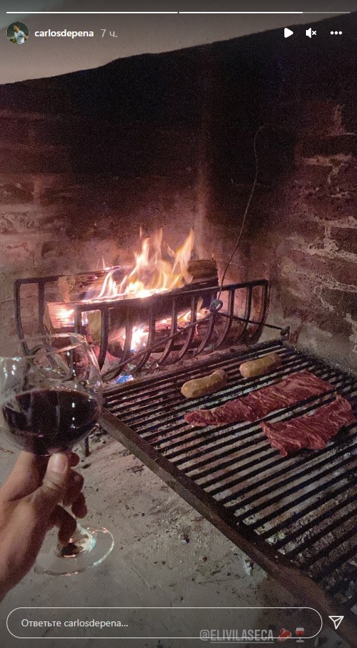 Уругвайський півзахисник "Динамо" Карлос де Пена розслабляється під час своєї відпустки. Футболіст вирішив провести вечір біля мангала, приготувавши на ньому м'ясо і сосиски і випивши келих червоного вина.