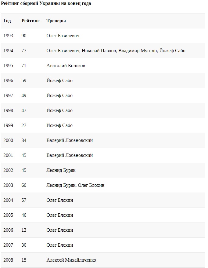 Взагалі ж національна команда не потрапляла в 50-ку кращих лише сім разів. Найгіршою позицією для неї було 90-е місце в далекому 1993 році. З тих пір показники збірної з невеликими перебоями йшли по наростаючій, а свого піку досягли в 2006-му, коли команда Олега Блохіна опинилася на 13-й сходинці. Пізніше українці ще двічі заглядали в топ-20-в 2008-му і 2013-му.