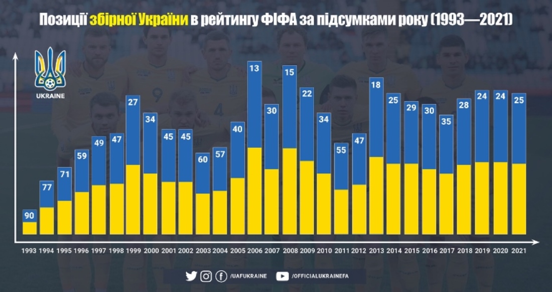 У грудні ФІФА оприлюднила фінальний рейтинг-2021 для національних збірних. Українська команда завершила рік на 25-й позиції на планеті і на 15-му місці в Європі. Це далеко не найгірше місце нашої збірної у світовій класифікації, але бували часи і краще, пише zbirna.com.