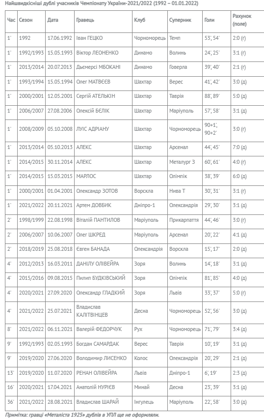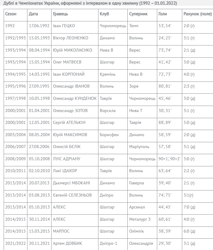 Серед дуплетистів виділимо Артема Довбика з «Дніпра-1», який в ході матчу з «Олександрією» забивав два голи найшвидше – з різницею лише в одну (!) хвилину. Так Довбик став новим співавтором рекорду Чемпіонатів України. Оформляли дублі з інтервалом в одну хвилину вже 18 гравців, в тому числі Алекс Тейшейра з «Шахтаря» – двічі. В ході поточного чемпіонату крім Артема Довбика покращили клубні рекордні швидкісні дублі Владислав Калітвінцев із «Десни» та Валерій Федорчук з «Руху», а Владислав Шарай став автором першого (!) дублю «Інгульця» в УПЛ.