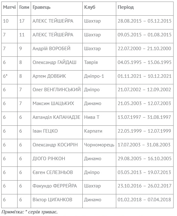 Найдовші гольові серіали в Чемпіонатах України (1992 – 15.12.2021)