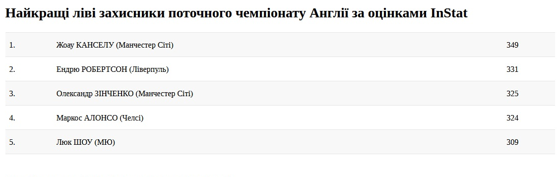 Захисник Манчестер Сіті Олександр Зінченко провів у цьому чемпіонаті Англії лише сім матчів, пише zbirna.com. У шістьох із них його команда перемогла, й українець мав у цих поєдинках пристойний вигляд. Середній рейтинг ефективності його гри за даними InStat склав 325 балів. Це шостий показник у команді та третій серед усіх лівих захисників ліги. Причому на першому місці серед гравців цього амплуа — одноклубник Зінченка, португалець Жоао Канселу, який часто діє й на інших позиціях.