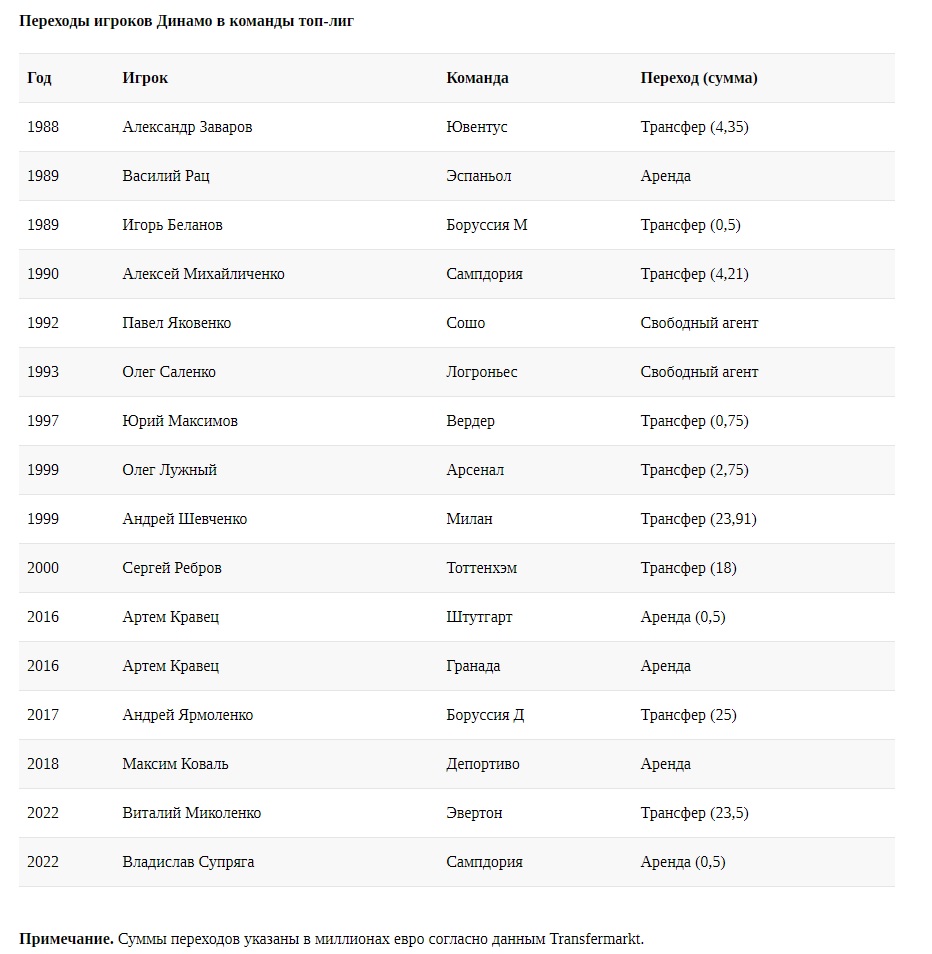 Почалися подібні рухи в кінці 1980-х, а першопрохідцями стали Олександр Заваров, Василь Рац та Ігор Бєланов. Досить багато знакових відходів з Динамо сталося в 1990-х. Наприклад, Олег Лужний і Андрій Шевченко перебралися за кордон в одне трансферне вікно. Потім настало затишшя, яке кияни порушили в останні кілька років.