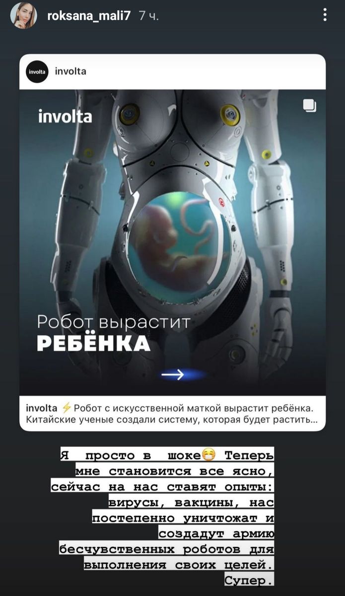 "Я просто в шоці, - відреагувала на цю публікацію Роксана. - Тепер мені стає все ясно. Зараз на нас ставлять досліди: віруси, вакцини. Нас поступово знищать і створять армію бездушних роботів для виконання своїх цілей. Супер".