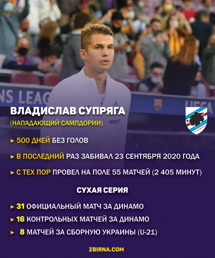 До речі, сьогодні у Супряги своєрідний ювілей - він не забиває рівно 500 днів. Причому на будь-якому рівні! Джерело порахувало всі його зіграні матчі з моменту останнього результативного удару. У тому числі і контрольні поєдинки, а також ігри у складі молодіжної збірної України. Виходить жахлива картина.