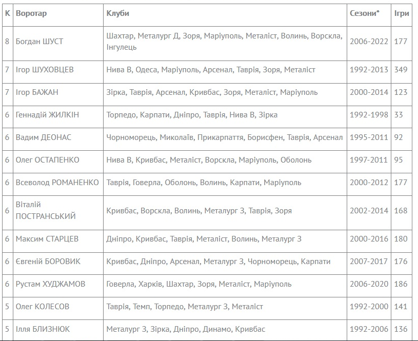 Очолю список воротарів з найбільшою кількістю клубів Богдан Шуст, який захищав кольори 8-ми клубів, в тому числі у першій частині VBET Ліги «Інгульця». Міграції воротарів відбуваються і під час зимової перерви у поточному Чемпіонаті. Так досвідчений Олександр Бандура з «Руху» нещодавно був заявлений за «Минай», який вже 25 лютого може стати для нього 6-м в УПЛ.