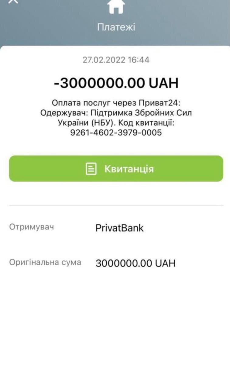 32-річний українець в якості благодійного внеску направив 3 мільйони гривень.