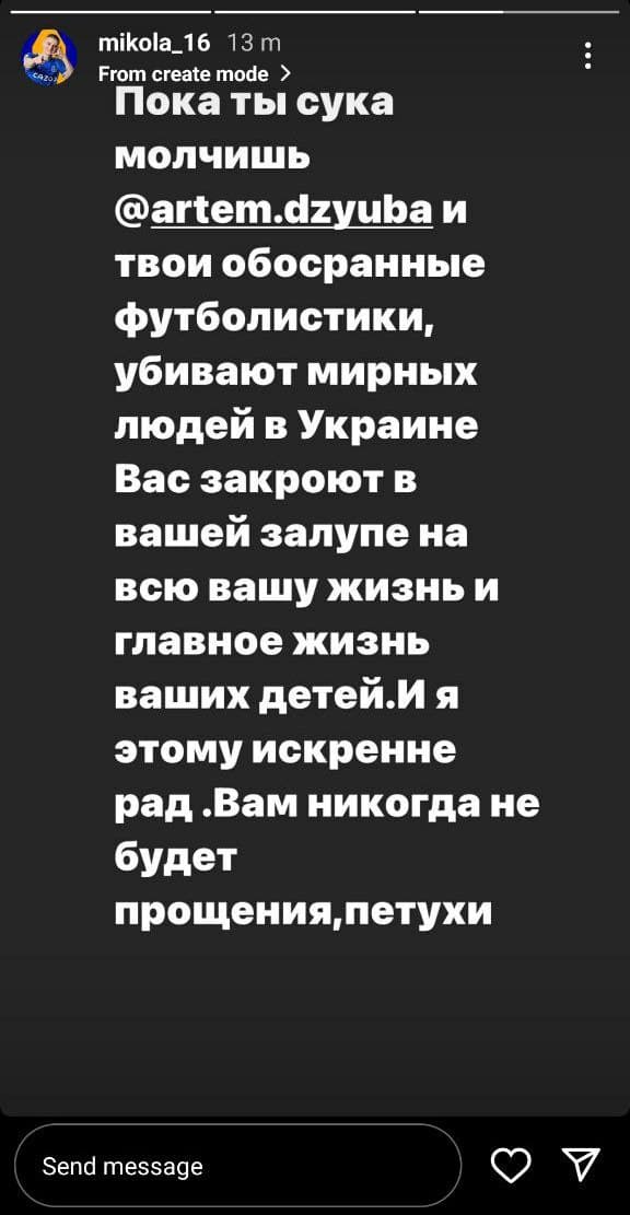 "Поки ти, сука, Артем Дзюба і твої обісрані футболістики мовчиш, вбивають мирних людей в Україні. Вас закриють у Вашій з****е на все ваше життя і, головне, життя ваших дітей. І я цьому щиро радий. Вам ніколи не буде прощення, півні", - написав Миколенко.