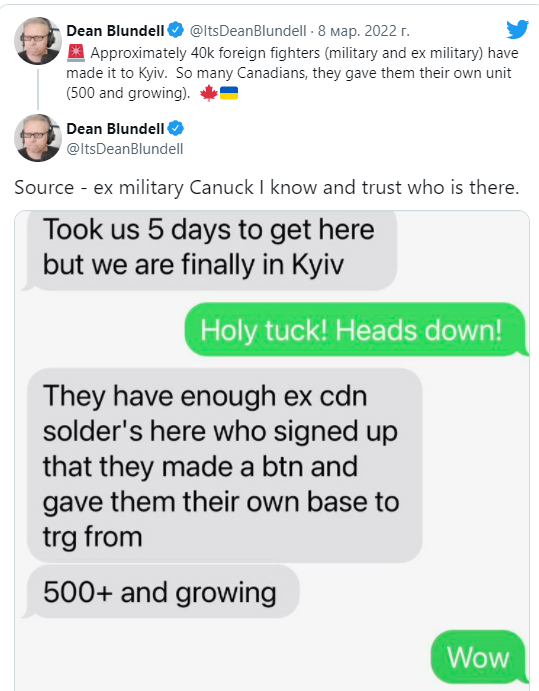 Канадський ведучий Дін Бланделл повідомив у Twitter, що до Києва дістались вже близько 40 тисяч іноземних військових та екс-військових. З них – більше 500 канадців (які ще продовжують прибувати), й тому для них буде створено окремий підрозділ.