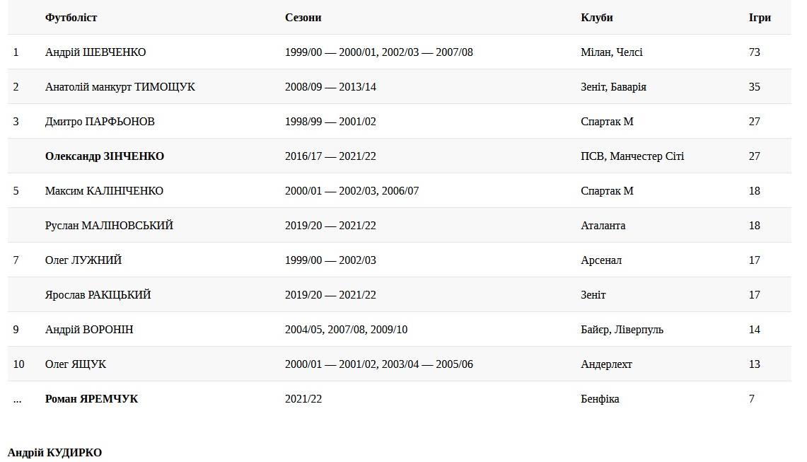 Наразі Зінченко наздогнав у рейтингу українських легіонерів у основній сітці Ліги чемпіонів Дмитра Парфьонова — обидва поділяють 3—4 місця. Вище — лише манкурт Анатолій Тимощук, який виявився запроданцем України, та Андрій Шевченко.