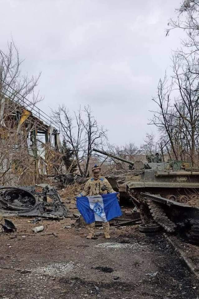 Український військовий сфотографувався з прапором "Динамо" біля танка на полі бою.