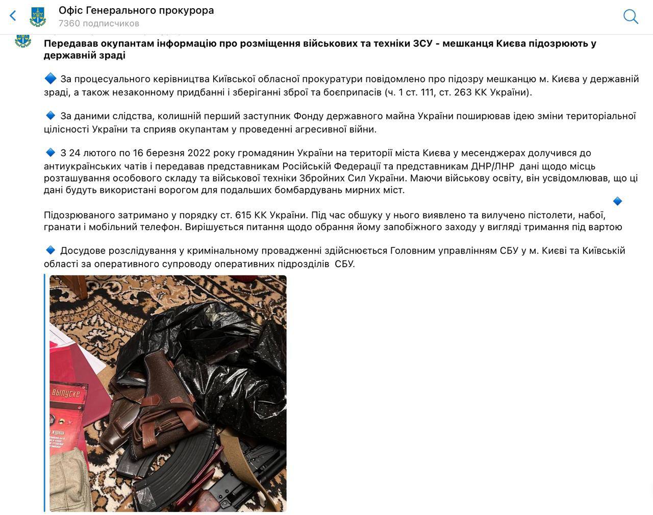 Гучна подія в Києві - правоохоронці затримали колишнього першого заступника Голови Фонду державного майна за підозрою в держзраді, повідомляє Телеграм-канал "Київський двіж".