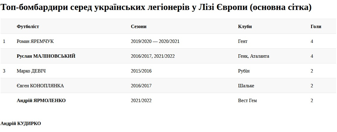 одного гола у основній сітці Ліги Європи — Андрій Ярмоленко. Нагадаємо,
