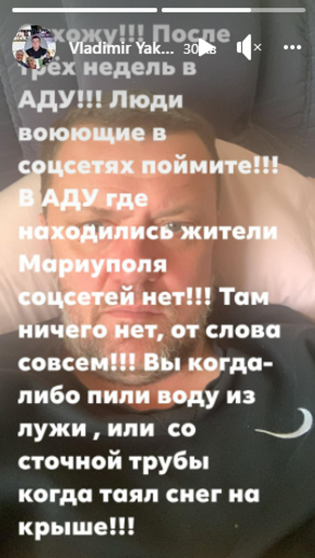 "Відходжу після 3 тижнів пекла! Люди, які воюють у соцмережах, зрозумійте – у пеклі, де живуть мешканці Маріуполя, соцмереж немає! Там нічого немає, від слова зовсім. Ви колись пили воду з калюжі або стічної труби, коли розтанув сніг на даху?" – написав Яксманицький в Instagram.