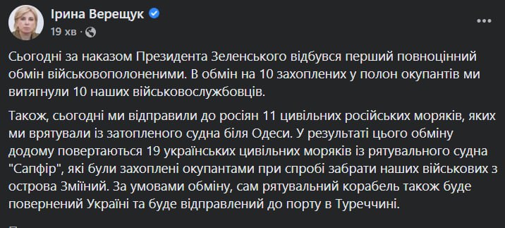 Про це повідомила віце-прем’єр України Ірина Верещук. За її словами, 10 російських військовослужбовців обміняли на 10 полонених українців.