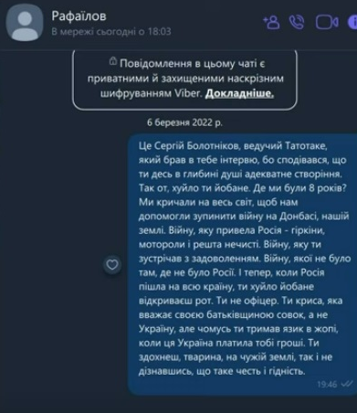 "Х***о й****е". Болотнiков показав повідомлення, яке написав Рафаїлову після його слiв про Україну