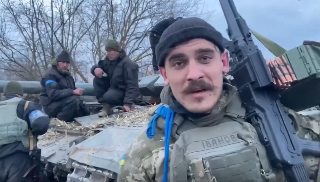 Боєць білоруського батальйону показує знищену техніку росіян.