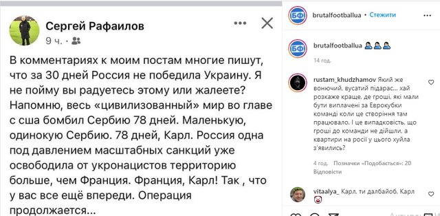 "Який же смердючий, вусатий під**ас... Хай розкаже краще, де гроші, які мали бути виплачені за єврокубки команді, коли це створіння там працювало. І це випадковість, що гроші до команди не дійшли, а квартири на росії у цього х*йла з’явились?" – написав Худжамов.