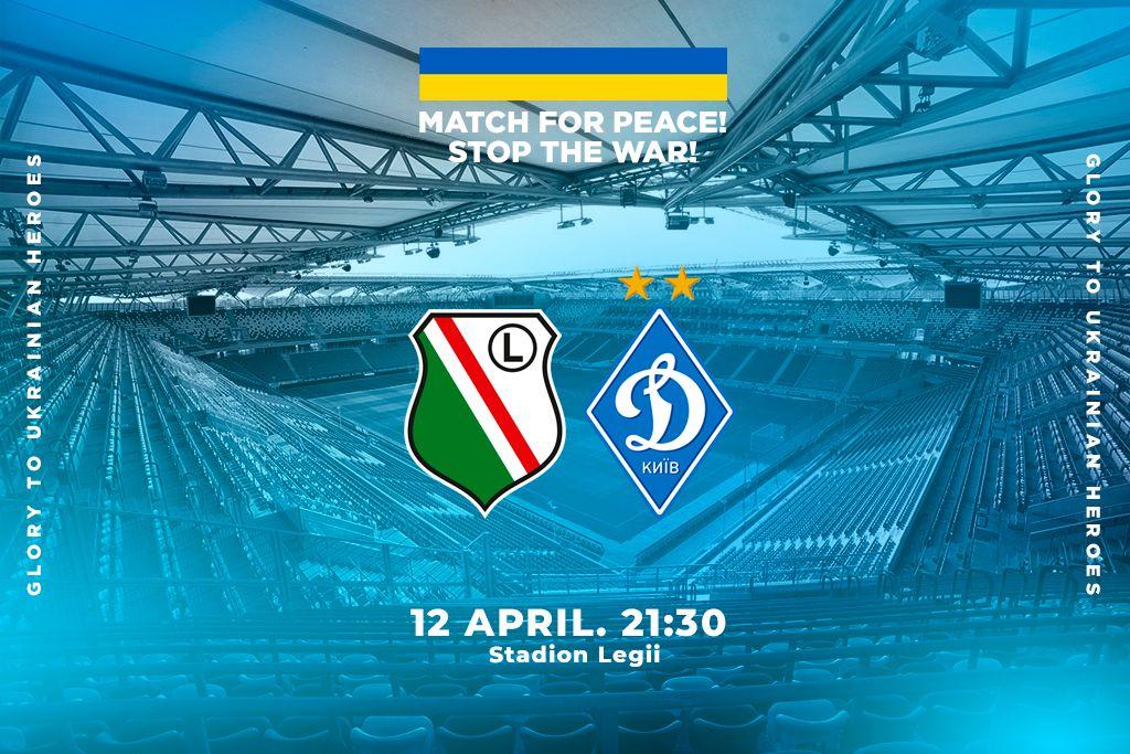 2 квітня о 20:30 (СЕТ, 21:30 за Києвом) на стадіоні Stadion Legii у Варшаві розпочнеться благодійний матч Match for peace #StopWarInUkraine між командами «Легія» з Польщі та українським «Динамо». Транслюватиме подію польський телеканал TVP, українські мовники 2+2, 1+1 International, Динамо Київ TV, платформи онлайн-телебачення 1+1 Video, Київстар ТБ, YouTube-канали FootballHub, «Динамо», ТСН та УНІАН.