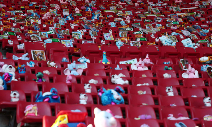 176 іграшок розклали на трибуні перед матчем "Шахтаря" та "Олімпіакоса" на честь загиблих у війні дітей